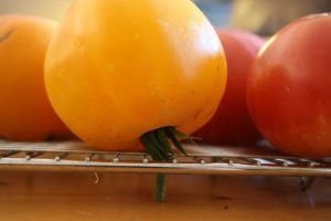 Pois é!, não se deve guardar o tomate no frigorífico, este é um erro muito comum. E outra coisa comum, mas nesta estamos certos, é saber que o tomate é um fruto e não um legume. Pois bem, esse fruto, mesmo plantado, não se dá bem no frio, portanto, depois de colhidos também não vão gosta nada do frio. Os tomates devem ser guardados numa fruteira, e de cabeça para baixo (como indicado na imagem). Se forem colocados no frigorífico, ficarão farinhentos, perderão o sabor e quando muito, dará para aproveitar para molho. Tente fazer isto e terá um tomate mais gostoso para a sua salada. Para que não se estraguem, compre só o necessário para o seu uso semanal.